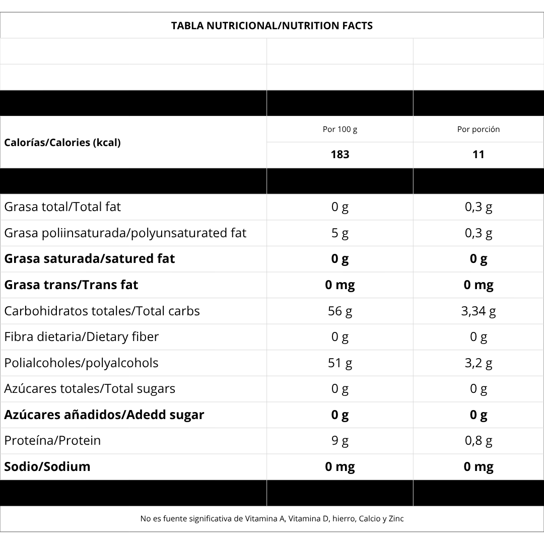 Maltitol E-965, Sorbitol E-420, Gelatina Bloom 280 (Gelificante), EPA (ácido eicosapentaenoico), DHA (ácido docosahexaenoico), Aceite de coco (MTC), Almidón modificado de papa (Espesante), Ácido cítrico E330 (Acidulante), Goma Guar E- 412 (Espesante), Sabor idéntico al natural mandarina, Stevia (Edulcorante), Color naranja, cobre. Agente de recubrimiento: Cera de carnaúba, Aceite mineral